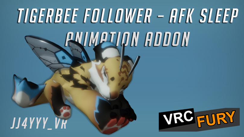 The Tigerbee Follower – AFK Sleep Animation Addon automatically makes your follower nap adorably when you go AFK in VRChat — or you can manually trigger it via the Expression Menu.